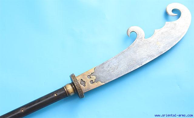 This heavy Pole arms is Chinese, late 18 – Early 19 C. , also known as: xiangbidao ( Elephant trunk Knife). Heavy blade with curling tip is 21 inches long, fnely engraved and decorated with inlaid brass circle. Large brass bolsters and cross guard. 12 inches steel tail with steel rings. Original wood haft. Total length 85 inches. Very good condition. Very Scarce item.