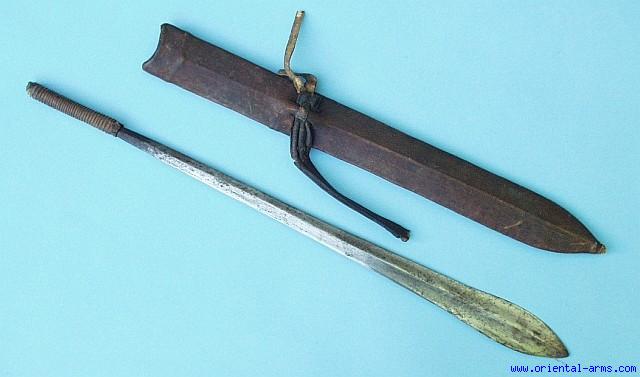 Seme, The classical sword of the Massai people of East Africa. 20 ½ inches long, well forged blade widening toward the tip, and with a strong central rib. Hide covered handle and hide scabbard. This is the real authentic Massai sword, not one of the many traps sold to the tourist visiting Kenya and the neighboring countries. Very good condition. Minor nicks on the edges. Broken carrying sling.