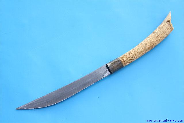 Probably from Burma or further north to Assam. Early – mid 20 C. 6 ½ inches signed blade with heat hardened edge and with what looks as an earlier finely carved bone handle. Total length 12 ½ inches. Very good condition.
