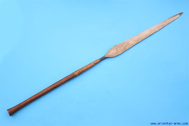 The Assegai, stabbing spear of the Zulu, known for their efficient use as a hunting implement and as a weapon of war. 38 1/2 34 inches long with an unusual large 18 ½ inches. Very good condition.