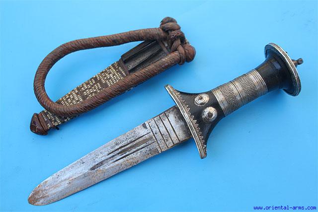 Up for sale is this fine and early arm dagger from Sudan. 6 inches well made fullered blade. Black wood grip with fine filigree silver mounts bounds with silver wired on the grip. Tooled leather scabbard with reptile skin mounts. Original arm loop. Total length 11 1/2 inches. Very good condition. |