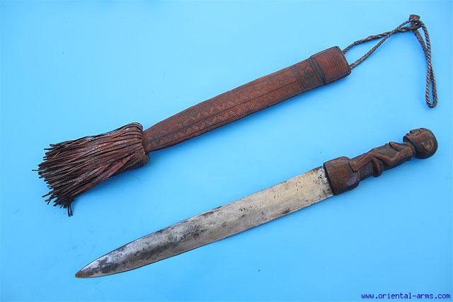 This long dagger is mid 20C., most probably from West Africa, may be Nigeria. 12 inches dual edge blade. Wood handle, finely carved in the shape of a naked female. Finely tooled leather scabbard with a long braided leather hanging loop. Total length 20 inches. Very good condition. |