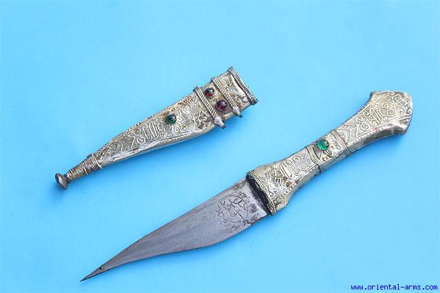 A typical good example of the Bedouin side dagger locally known as Shibriya. All men carry it and it is very popular between the Bedouin tribes residing in Israel and in Jordan. The blade is 4 inches, re-curving and double edged with an acute tip, signed with a maker sign. The grip as well as the scabbard are covered with chased white metal on the front side and iron sheet on the rear. Both the handle and the scabbard are set with colored stones (glass). The scabbard is set with a belt loop at the rear side. Total length 8 inches. Very good condition. Minor dents. |