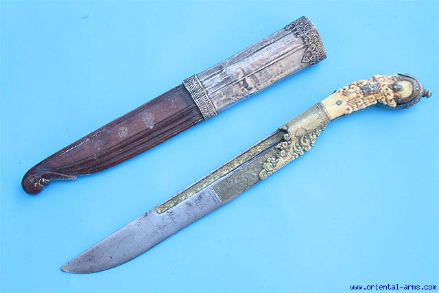 This type of knife / dagger is called “PIHA KAHETTA”, and it is the traditional knife of the Sinhalese from Sri-Lanka (Ceylon). This fine example has an 8 inches blade inlaid with engraved brass. Heavy highly decorative Brass bolsters. The grips are carved from Ivory. Original scabbard with silver collar. Total length is 11 ˝ inches. Very good condition. |