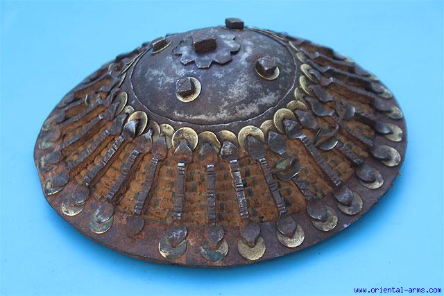 Rare example of an 18 C. Ottoman/Turkish arm war shield (Buckler). The shield is based on a central wooden core, bound with a spiral of cane or thick rattan covered with colored cotton threads. The central piece is covered with steel dome and the outer circumference is made of steel ring. The central dome and the outer ring are connected with 30 reinforcing steel bars and decorative brass imitation coins. Diameter is 10 inches, height 31/2 inches. Very good condition to age. |