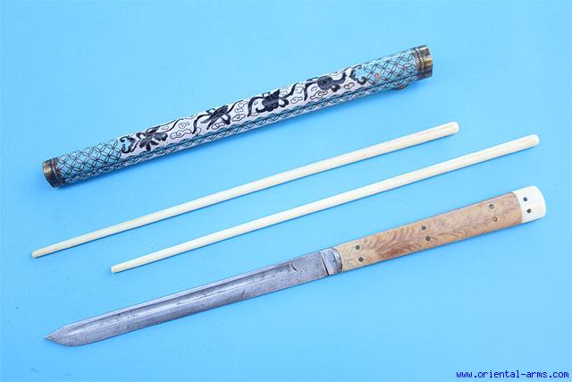 A Chinese ‘trousse’ (eating set), comprising a knife and chopsticks. This type of sets was very common in china and in all the countries under the Chinese influence from Tibet to Mongolia. It was part of a man formal dress up to the turn of the 20th century and usually accompanied with a variety of accessories like pickle spear, toothpicks, tweezers and the like. Similar sets are found in various sizes and quality. This one is a fine exemplar. The blade is 6 inches long very well forged and nicely fullered. The blade is signed. Grained wood grip with Ivory pommel sectors. Fine colorful cloisonné scabbard with brass mounts. Ivory chopsticks. Total length 12 inches. Very good condition. |