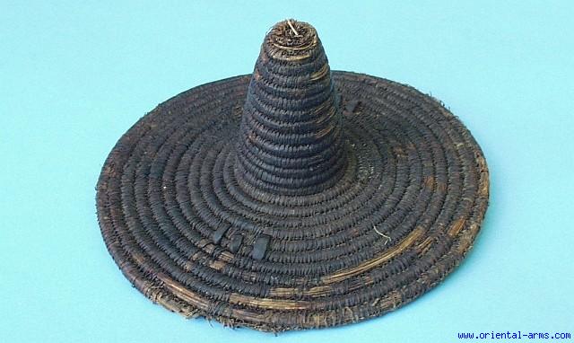 We offer for sale a rare Buckler (Hand Shield) of the Batammaliba tribe residing in the northern areas of Togo and Benin, just on the borders of Burkina Faso. This is basicly a defense shield used mainly against arrows but now also in use as a ceremonial artifact used in war dances and other ceremonies of the Batammaliba people. It is 9 inches in diameter, made of spiral canes wrapped with thin rattan fibers. A spiral cane cone rises from the center of the shield (probably a phallic symbol). For more details on this bucklers please see: Boucliers d’Afrique, d’asie, du Sud-Est et d’Oceanie du Musee Barbier-Mueller. p.36. Good condition. Two of the radial strips are missing and very few rattan fibers are broken. |