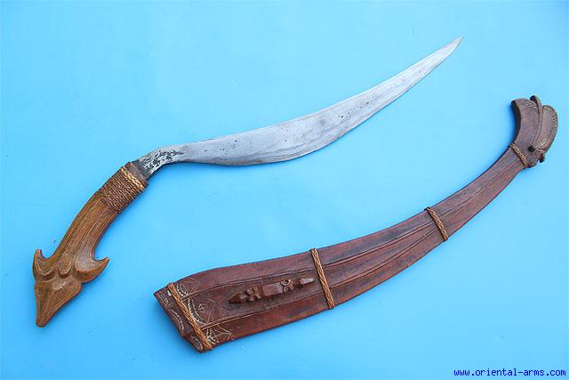 The Talibon sword is the main battle sword of the Christian tribes of northern Philippines. The blade is curved, very heavy 15 inches long. It is forged from finely laminated steel with heat hardened edge, beveled and deadly sharp. The wood handle is finely carved and bound with braided rattan strips. Carved wood scabbard with rattan binding. Very good condition. A fine authentic, 19 C. piece. |