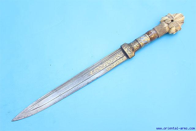 This fine knife is late 19C – Early 20C. Knives with somewhat similar handles with the amber color ball shaped spacers are usually attributed to Iraq or Syria. This specific one is earlier, of much higher quality than most on the market. Good gold koftgari work on the blade and the handle. Carved walrus double heads pommel. Blade 9 inches, total 14. Very good condition. No scabbard. |