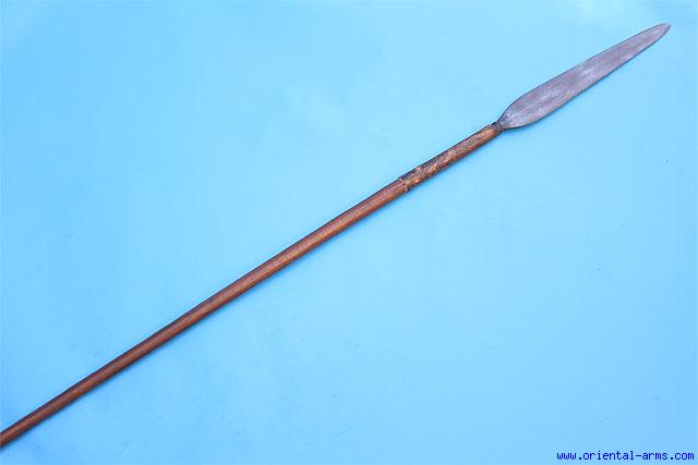 The Assegai, stabbing spear of the Zulu, known for their efficient use as a hunting implement and as a weapon of war. 44 1/2 inches long with an large 11 ½ inches well forged blade, secured with hide binding on the haft. Very good condition. Good homogenous age patina on the blade. |