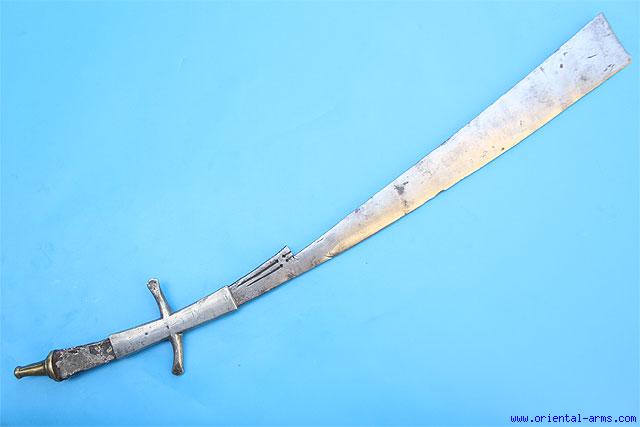 The Pandat, also known as Parang Pandit is the war sword of the land Dayak of Sarwak, in North West Kalimantan (Borneo). It is a two handed sword, used only as a war sword and never as a tool, a multiuse which is so common to other blades from the Indonesian archipelago. Blade and handle are forged from one piece of steel. This specimen has a 16 inches blade, widening toward the tip. The grip is white metal and the pommel is a brass button. Total length 23 inches. Very good condition. No scabbard. |