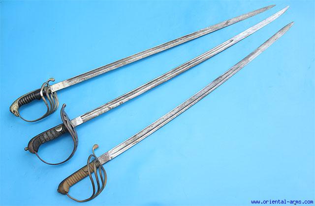 Up for sale is this lot of three military swords, 34-35 inches long, two with marked blades, basket hilts. Very good conditions. No scabbards.