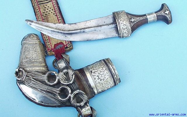A very fine and good quality Arab Jambiya dagger from Oman. It has a 7 ½ inches curved and dual edge blade with a pronounced central rib. The hilt is made of fibrous looking horn of the classical “I” shaped, decorated with silver nails on the front side and silver sheet on the rear. The scabbard is “L” shaped covered with leather. The belt attachment is made of complicate arrangements of silver rings and twisted silver wire. All scabbard and hilt fittings are silver chased in a typical design. This item comes with its original belt, embroidered with red and black threads and terminate with a silver buckle. Very good condition. The blade has few pitted areas . This is an item of high quality and in very good condition, a good typical piece for the advanced collector of Arabic weapons / art. |
