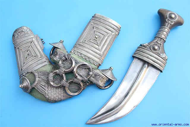 A very good and Massive Arab Khnjar / Jambiya dagger, mid-late 20 C., from Oman. It has a strong massive 7 inches curved and dual edge blade with a pronounced central rib. The handle is rhino horn with silver mounts. The scabbard is “L” shaped mounted with filigree silver locket en suite with the hilt mounts. The belt attachment is made of complicate arrangements of 7 silver rings and twisted silver wire. Total length is 12 inches. Very impressive Khanjar |