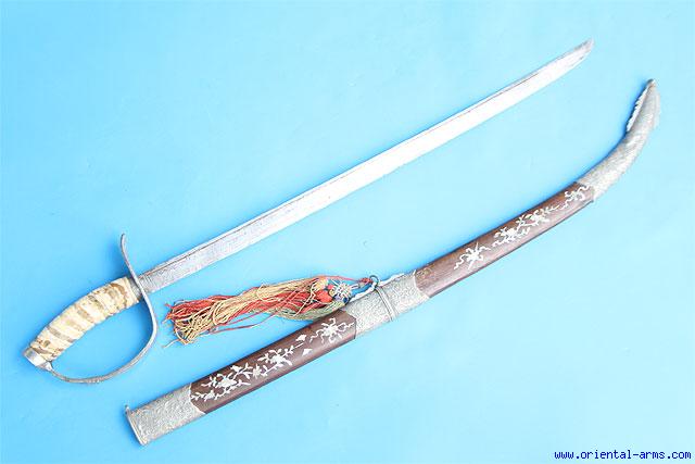 Up for sale is this dress Vietnamese sabre. The single edged grooved blade is slightly curved and lightly engraved. The hilt is pewter and the grip is elephant molar bone with pewter pommel. The scabbard is finely inlaid with a mosaic of mother pearl pieces and mounted with three finely chased pewter fittings. Good condition. Some small dents on the pewter parts. Small repairs on the grip and restored pommel head. A rare piece. |