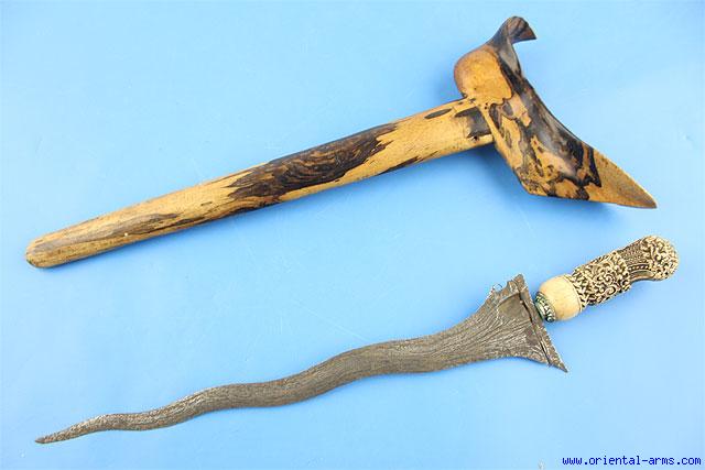 Here is a very fine Java Keris dagger. It has 13 inches wavy pamor blade. Very nice grained wood scabbard with . Fantastic carved bone hilt with stylized figure of devil head, Raksasa style. Total length 18 1/2 inches. Very good condition. Mid 19C. Fine piece
