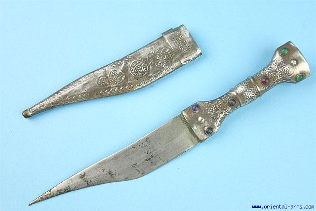 A very good example of the Bedouin side dagger locally known as Shibriya. All men carry it and it is very popular between the Bedouin tribes residing in Israel and in Jordan. The blade is 6 1/2 inches, re-curving and double edged with an acute tip. The grip as well as the scabbard are covered with chased iron sheet rich with inscription in Arabic letters, dated to 1955 and set with colored stones (Glass ?) . Total length 11 ½ inches. Very good condition. Scabbard cover slightly dented.. |