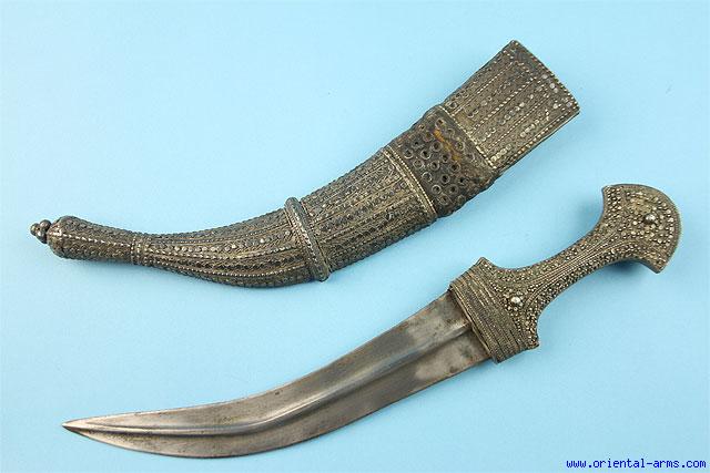 This large and heavy Yemenite Jambiya dagger is coming from the Tihama region on the western coast of Yemen, also known as Joulba. The heavy blade with strong medial rib is 10 ½ inches long. The handle and scabbard are heavy silver with filigree and granulation work. Total length 19 inches. Very good condition. |