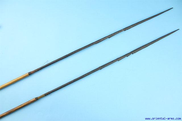This two long arrows with wood heads are most probably coming from the Amazonas area. The heads are barbed hardwood, 24 inches long. The hafts are some type of cane. Total length 53 ½ and 54 ½ inches. Very good condition. One haft repaired.