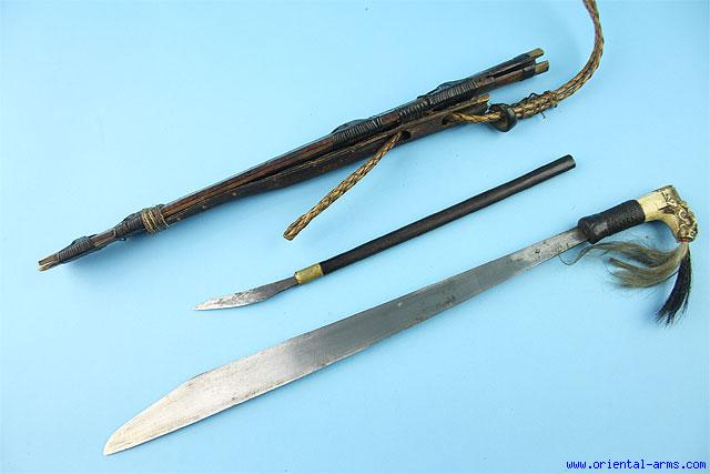 This MANDAU (sometimes also called “Parang Ihlang”) is a late 19C with a heavy 21 inches long 10 mm thick blade with unusual fuller on the convex face. The handle is “L” shaped, carved from bone and bound with braided rattan strips, with a tufts hair on the pommel tips. Dark hard wood scabbard bound with rattan strips in a decorative pattern. This Mandau comes with the side knife (Piso Raout) , in a rear compartment made of wood bark. Total length 27 inch. Very good condition. Minor losses to the resin cover of the grip end. An original authentic piece for real use. |