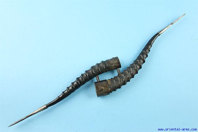 The Fakir Horns were usually a non metal weapon and an excellent and lethal substitute, used by Indian Fakirs who were not allowed to use real steel. It is composed of a pair of antelope horns with sharpened tips connected in the middle and, yet in some rare cases like this one, the horn tips are set with steel blades, 2 ˝ inches long each, in steel sockets. Total length 23 inches tip to tip. Very good condition. Good age patina on the horn and the blades. This is an authentic and rare form of Indian weapon. Probably early 19 C. or earlier. |