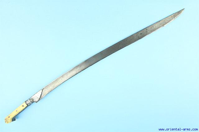 Up for sale is this Turkish Yataghan. The blade is 25 inches long marked with a maker stamped. The grips are ivory and bolsters are with silver decoration. Total length 30 inches. Grip strap missing the silver decoration. The ivory ears are slightly chipped. No scabbard. Very attractive price. |