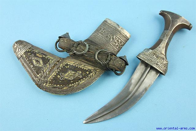 A typical early 20th C Arab Jambiya dagger. This style of daggers is called Omani, as its originate from Oman. However it is spread as well as other Jambiya’s styles all over the Arabian Peninsula. It has a 6 inches curved and dual edge blade with a pronounced central rib, forged from good steel (not like many new Jambiya’s on the market whose blade are made from two-iron sheet pressed to form and welded together). The hilt is hardwood in a classical “I” shape with a silver front panel and silver fittings. The scabbard is “L” shaped covered with leather densely braided with silver and gold wires in an intricate decorative pattern. The belt attachment is made of complicate arrangements of silver rings and twisted silver wire. All scabbard and hilt fittings are silver chased in a typical design. Good condition. Some losses to the gold strips. A good old original dagger.