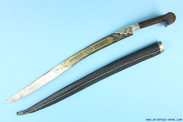 Up for sale is this very good Yataghan sword, Turkish or Balkan. Blade 22 inches richly decorated with gold koftgari work and dated on the spine. The year is a bit blurred but it looks as 1223 (1808 in the Gregorian calendar). Horn grips with silver bolsters and grip strap. Leather covered scabbard with spiral stitching (later) and white metal mounts. Total length 29 inches. Very good condition. |