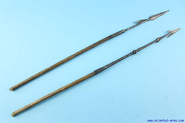 These two spears are African, probably south east Africa, late 19 – early 20C. Heavy blades9 inches long, one with barbed tang. Shortened haft (Probably cut down to ease its shipment to Europe when collected in Africa). Total length 29 inches. Very good condition. |