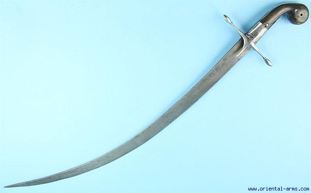 This heavy shamshir sword is probably Turkish with some later Syrian – Arab modifications. The blade is wootz (Damascus, watered) steel, Persian made trade blade31 ½ inches long, late 18 - early 19C., signed by the maker. Silver cross guard. Later late 19 – early 20C. replaced grip strap and horn grips bound with silver wire, probably a Syrian –Arab modification. Total length 37 inches. Very good condition. Very light blackened spots near the blade tip. No scabbard. |