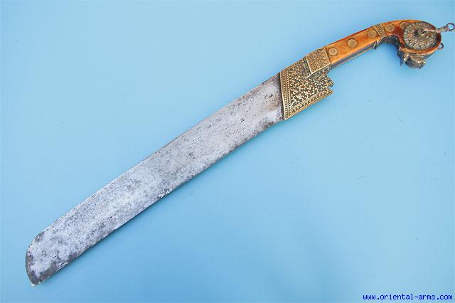 This Large knife is coming probably from the Coorg people of Karnataka state in south west India. It reminds in a way the Pichangeti , a more common knife of the Coorg. The massive single edge blade is 14 inches long, 2 inches wide. Finely chiseled brass bolsters and ivory grips with brass mounts. Total length 19 inches. Very good condition. Very good age patina on the ivory grips. A very rare knife. |