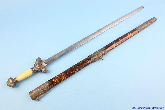 This fine straight, double edge sword is Vietnamese, early 20 C. , also known as Kiem. Its narrow long well forged blade is 27 1/2 inches long with a shallow diamond cross section. The handle is composed of an ivory grip with very finely chased big silver pommel and cross guard. Wood scabbard covered with tortoise shell and with beautifully chased silver mounts. Total length 38 inches. Very good condition. Old age crack on the grip side but it holds very solid. A very impressive sword. |