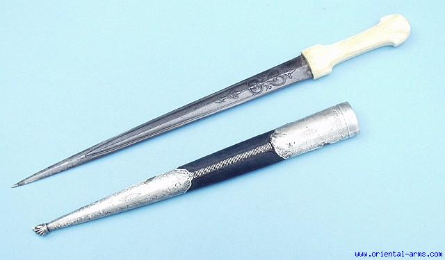 This superb wootz dagger is also known as Ottoman Court Dagger. it was a side arm of the nobilities visiting the courts of the Ottoman empire in the 17 and 18 C. The thick blade is of diamond cross section, 14 inches long, tapering to an acute tip. It is forged from very good black Persian wootz (Damascus steel). The grip is elephant ivory, probably 19 C. and somewhat later to the blade, and the scabbard is wood covered with black leather and mounted with engraved silver locket and chape. Very good condition. Few pitted spot near the blade tip. Minor damage to the silver locket. The top of the locket is newly made. |