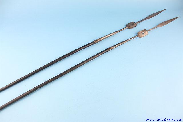 A nice pair of African spears. We are not sure about the origin but most probably they are Ethiuopia. The 14 inches blades have a decorated square base, with 9 inches long sockets. Total length 60 inches. Very good condition. Mid 20c.