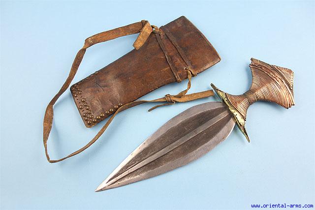 Up for sale is this very good dagger of the Lobala people from Northern Zaire. Very typical in the blade shape and wood handle. The blade is 11 inches long 3 ½ inches wide, spearhead shape with a central rib and with the original blackened patina. The handle is wood bound with copper strips. This dagger comes with its original scabbard, wood covered with leather and decorated with brass tacks. Very good condition. Rare to find these swords with the original scabbard. |