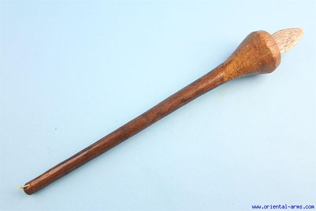A nice old African Knobkerrie club with blade. The club is 17 1/2 inches long 3 inches wide at top, with a 3 inches blade. Very good condition. Wood chip on the head good age patina. Unusual item.