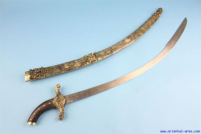 This very fine sword is Hungarian, late 19C or early 20th a presentation sword. Fine watered steel wootz kilij type earlier blade 30 inches long with a 10 inches raised back edge. The wood scabbard covered with ray skin and mounted with gilded silver fittings set with Malachite and pink stones. Unusual gilded silver cross guard in a shape of animal feet, sets with malachite stone. The grips are horn with signed pommel (Monogram). Total length 38 inches. Very good condition, minor loss to the ray skin. Very impressive sword.