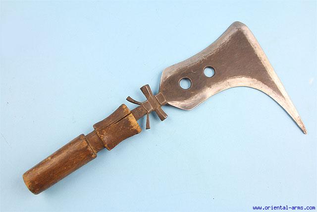 The knife of the Mangbetu people residing in Central Africa was originally used as a weapon of war and also as an agricultural implement, but later on developed into luxury item and a symbol of status. A photo below shows a drawing from the late 19 C. of Munza the king of the Mangbetu on his crown, holding high a similar knife as a symbol of power and authority. This one is late 19 C or early 20 C. piece, sickle shaped, vary well forged and sharpened all around. Blade 9 inches long, 8 inches wide total length (tip of blade to pommel) 16 inches. The blade maintained its original blackening with polish edges. Very good condition. Small cracks to the wood hilt.