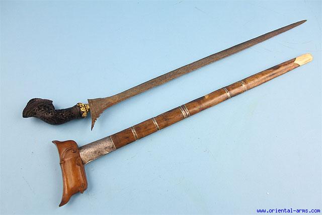 A Keris Penjang , also sometimes referred to as Execution Keris from Sumatra. This rare type of Keris was supposedly used to execute criminals. The long narrow blade was inserted above the collarbone of the sitting executed person and pushed down directly into the heart, causing instant death. The blade of this specific Keris is 19 1/2 inches long, forged from pamor steel. The hilt is beautifully carved horn. Gilded decorative mendak. Wood scabbard with engraved silver mounts and ivory tip. Total length 25 inches. Very good condition, the blade lightly worn. Very good exemplar. |