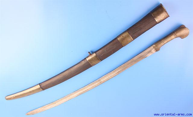 Here is an unusual Shashka Saber. The Blade is 29 inches long slightly shortened. Steel grip, mounts and long chape. Wood scabbard covered with black leather (later). Total length 38 1/2 inches. 19C.