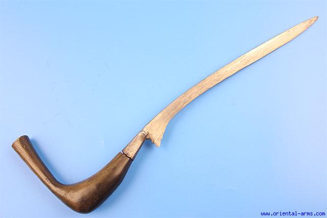 A RENTONG knife / dagger from the Malay Archipelago, mostly used by the Ache people from North West Sumatra (see Stone Glossary, fig. 106 number 4 page 85). The blade is 11 inches long down curving and single edged, 10 mm thick at the base, forged from fine laminated steel. The hilt is horn with the pommel end sharply up-curving. Total length 16 inches. Very good condition. Minor age cracks on the handle. No scabbard. |