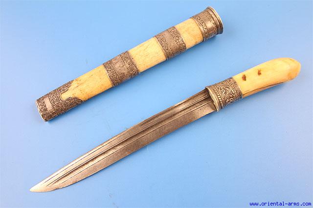 Here is a very fine dah Knife from Burma. It has a fine single edged fullered blade 8 1/2 long, ivory handle and rare solid bone scabbard with vvery nice chased silver mounts. Very good condition. late 19C.
