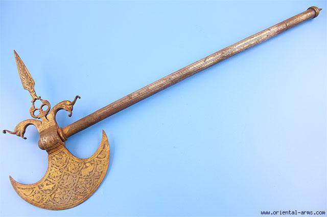 Up for sale a very nice gilded qajar Axe of unusual shape. The blade is 7 inches long chiseled with nice flowers, birds and animals. It has a rear spike 5 1/2 inches long with beautiful base carved in a shape of stylized animals. Nicely ribbed haft. Total length 26 1/2 inches long. Very good condition, some of the gold is worn. It is dated early 19c. An impressive unique item.