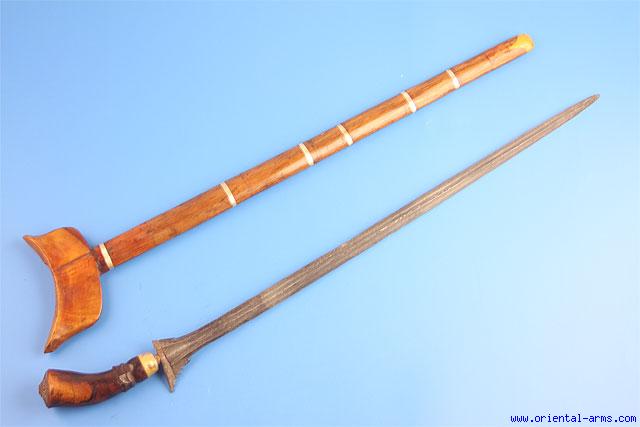 A Keris Penjang , also sometimes referred to as Execution Keris from Sumatra, late 19 -early 20 C. The blade is 21 inches long, forged from pamor steel and nicely fullered. The hilt is grained wood with a brass mendak (later). Fine wood scabbard with silver bands and ivory tip. Total length 25 inches. Very good condition. |
