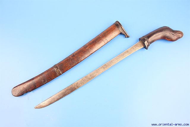 This long knife / short sword is coming from Indonesia, probably Java. Pamor blade 12 ½ inches long. Hard wood handle carved in the shape of a bird head. Wood scabbrd. Total length 17 ½ inches. Very good condition. Minor wood chips.