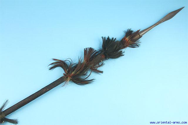 Up for sale is this spear of the Naga people from North East India. Early 20 C. 7 inches steel blade connected with a 5 inches socket to the palm wood pole which is decorated in the classical Naga style with red and black tufts of hair all around. Total length 64 inches. Very good condition. Some losses to the air tufts at the lower part