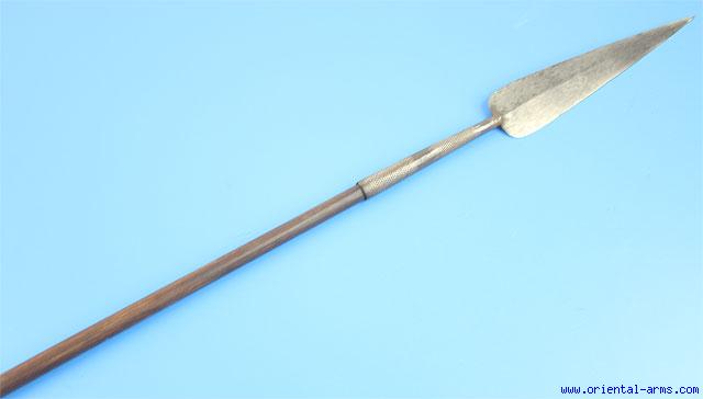 The workmanship and forging quality of this short spear looks Indian to me, late 19C. Blade 9 inches of shallow diamond cross section. 5 ½ inches open socket engraves with a checkered pattern. Total length 42 inches. Very good condition. Tail tip missing (?). Very low price. |