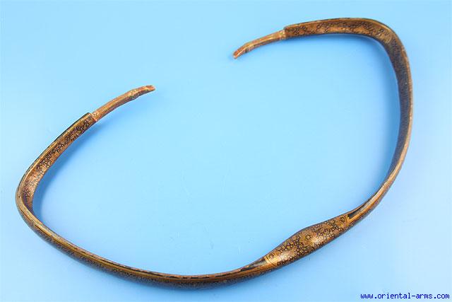 Here is a very fine late 17c - early 18C Mughal lacquered composite bow. It is made of horn and sinew glued together, entirely covered on both sides with beautiful copper/ gold colored painting of flowers on a black background. The tips are signed with Arabic letters. Minor losses to the lacquer. Very rare to find in this condition. A fine item. |
