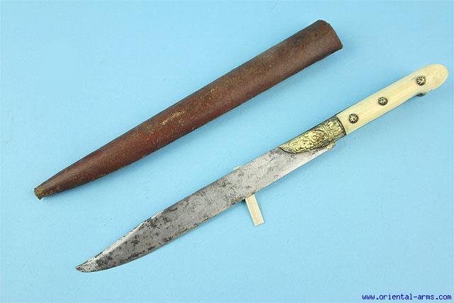 This short knife in the shape of a small Yataghan is of Greek origin, late 19 C also known as Bichaq. Its single edge blade is 10 inches long, with a 3 inches clipped spine, lightly engraved. The grips are bone and the grip strap and bolsters are chased brass. Leather covered scabbard. Total length 16 inches. Very good condition. Few pitted spots on the blade . |