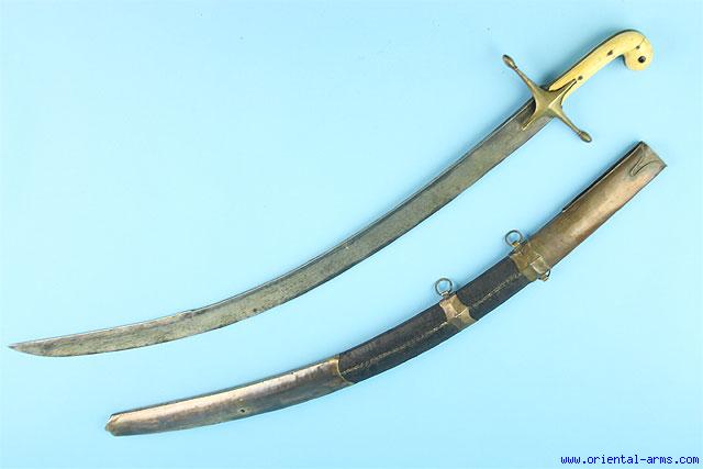 This sword is known as Pala or Kilij. It is Turkish, early 19C. with a vgood curved blade 30 inches long, with a 10 inches false edge. It is forged from fine pattern welded steel in a pattern known as Turkish Ribbon, composed from layers of twisted steel rods. This pattern was common to fine Turkish blades from the 17 C. and on. Nice old ivory grips with good age patina, Brass grip strap cross guard. The wood scabbard covered with original black leather, with spiral stitching, mounted with brass mounts and rings.Total length 36 inches. All parts are original, Very good condition. A solid age crack to ivory.